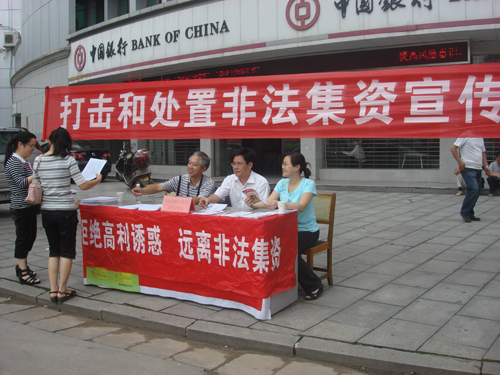 6月20日,县政府金融办工作人员在天岳大道中国银行门前开展“打击和处置非法集资宣传活动”,深入宣传非法集资的危害性,告诫广大市民“拒绝高利诱惑,远离非法集资”。活动中,共发放宣传册千余份,并设咨询台现场解答市民疑问。