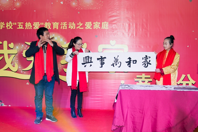 开场鼓《最炫小苹果》的热烈、激扬,一下子把大家带进了的“过年”的热闹与喜庆之中。教师自创的《幸福之歌》,用《北国之春》曲调演唱,从“家庭”、“名利”、“事业”三个方面给人以幸福的启迪与引领。父亲笛子伴奏,女儿表演书法,母亲在一旁帮忙,其乐融融,正是“家和万事兴”!配乐朗诵《甜蜜的思念》,由华艺音乐学校学生伴舞,情真意切,催人泪下,是“慈母手中线,游子身上衣”的印证,值得沉迷游戏、玩物丧志、不思进取的人们深思!《母亲》由一个为人子、为人父的老师独唱,他几度哽咽,将妻子献上的围脖,转送给了母亲,他的女儿立即上去紧紧搂着父亲,这场面何时有?这震撼在今天!《懂得珍惜,才会拥有》的演讲,朴实无华,分享了婆媳和睦的诀窍。