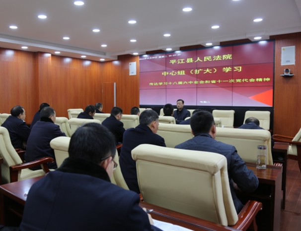 12月20日,平江县人民法院召开党组中心组学习会扩大会议,专题学习党的十八届六中全会精神和省十一次党代会精神。会议邀请县委宣传部邓姝林作辅导报告。院党组书记李明主持会议并讲话,班子成员、专职审委、中层骨干及各党支部书记参加了学习。
