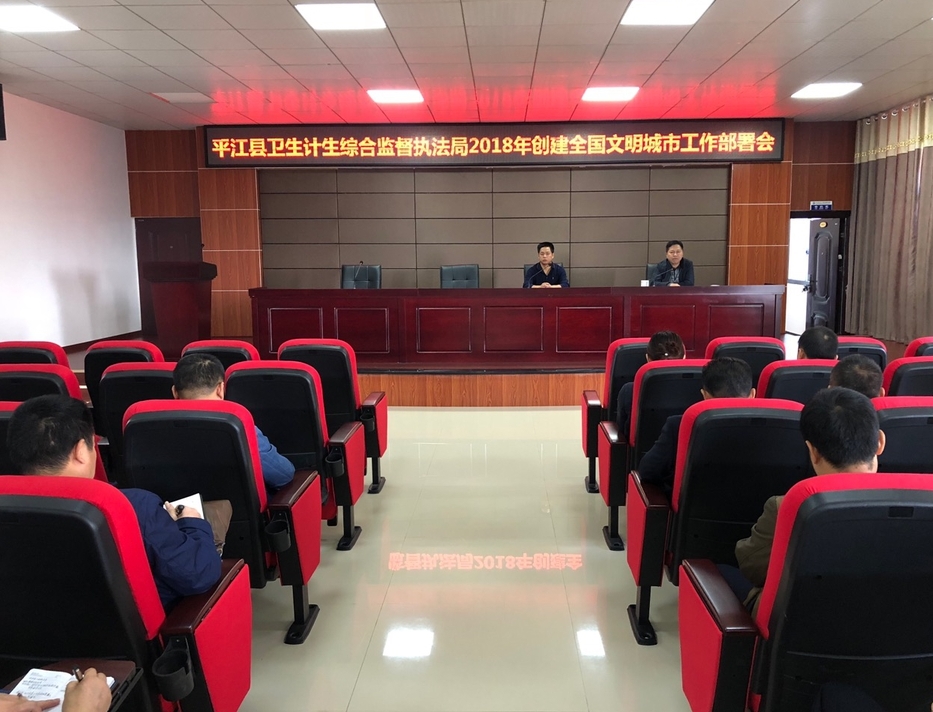 为全面做好文明城市创建,营造整洁优美、文明有序的城市综合环境。近日,平江县卫生计生综合监督执法局根据县委办[2018]9号文件要求,召开2018年创建全国文明城市工作部署会,并结合自身工作职能,展开公共场所卫生、学校卫生、生活饮用水、医疗机构、打击非法行医等监督行动。