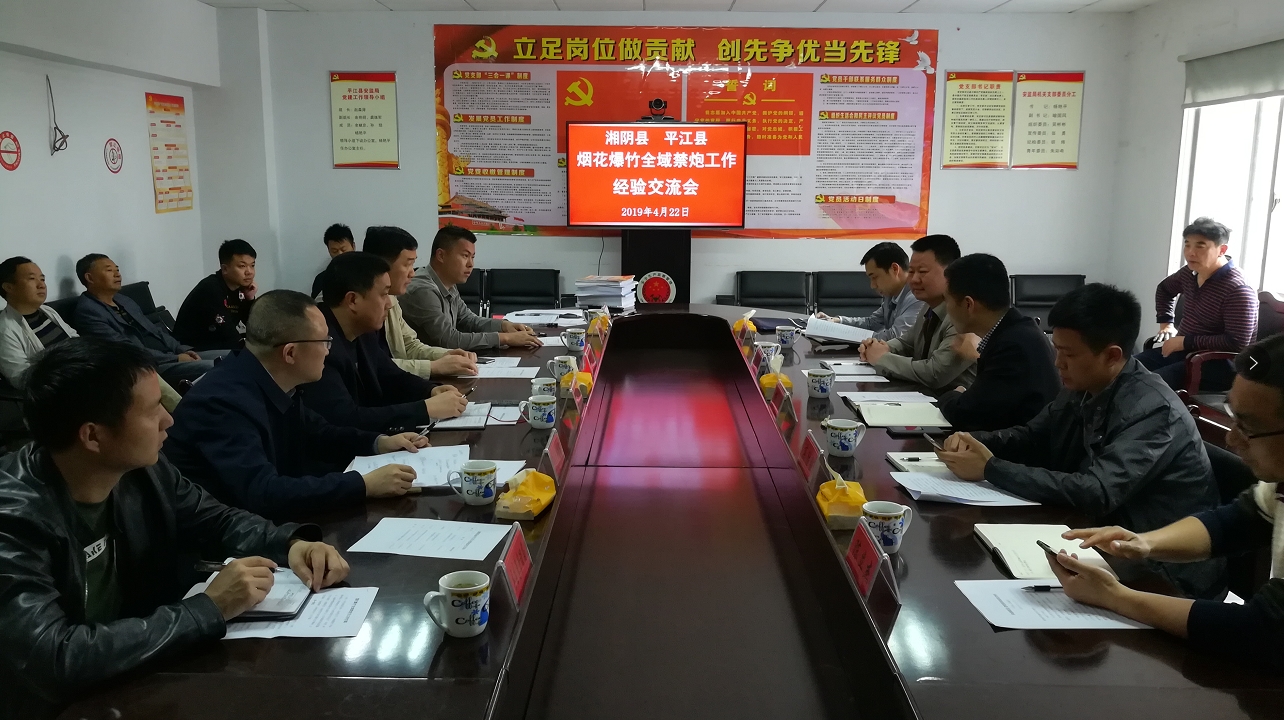在经验交流会上,李芸芳对考察组一行表示热烈的欢迎,他详细介绍了平江的经济社会发展情况和全县“全域禁炮”工作的背景、由来、成效、所经历的一些困难及主要工作方法,会上双方就禁炮工作的相关问题展开交流。会议就平江如何开展“全域禁炮”工作,作出具体阐述,一是推进烟花爆竹生产企业逐渐退出,通过奖补退出企业、消化库存等措施,从源头上控制了烟花爆竹“零生产”;二是坚定不移地推进烟花爆竹“全域禁炮”工作,通过建立“打非清剿”的长效机制,明确禁炮目标及各禁炮工作责任主体,严格督查考核以及追责问责,细化奖惩等措施,切实将禁炮工作推深到底。