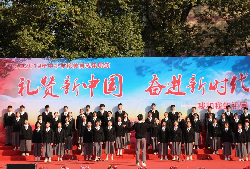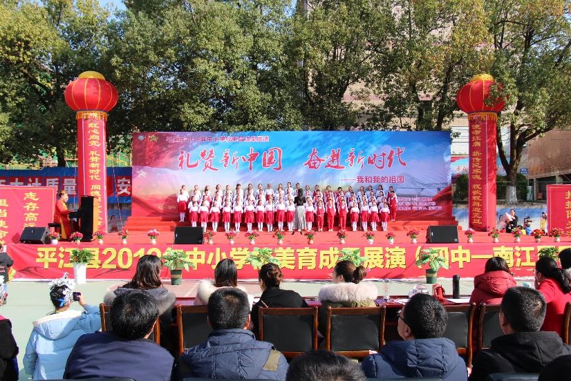 为切实推进新时代中小学美育工作落地开花,传承中华优秀传统文化,弘扬新时代美育精神,厚植爱国主义情怀,12月27日,平江县2019 年中小学校美育成果展演(四中-南江展区)在承办单位平江四中校园举行。平江四中、南江学区各中小学及幼儿园2700余名师生、县教育局与部分乡镇领导、南江学区主任及各中小学校长参加。