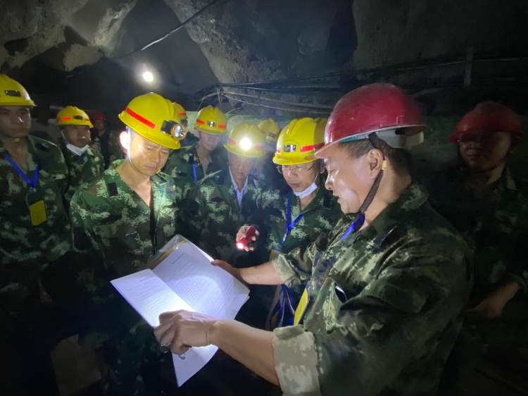到团家洞金矿后,县指挥部听取了凯鑫公司介绍近年来的发展情况汇报,并观看了该公司的对外宣传片。接着全体穿戴矿工装备,乘车深入垂直深度300多米矿井底部,又步行约1公里来到的综采工作面,对矿洞高度、井下设施设备、省402工作队资源储量核实工作进展情况等进行了详细了解。升井后,汤电辉要求凯鑫公司全力配合此次核查工作,同时要求省402队将安全摆在首位,抓紧时间、工作严谨,全力以赴做好资源储量核实工作,确保按时、按质完成工作任务。