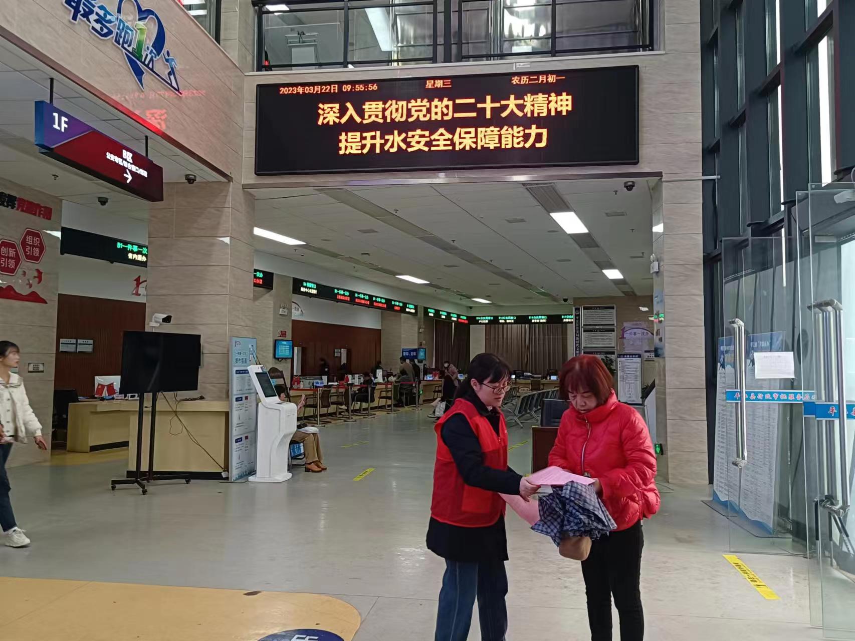 当天,该局利用各种载体开展集中宣传。在大厅电子显示屏上滚动播放“世界水日”、“中国水周”宣传口号;在政府门户网站、微信公众号,以及工作群广泛宣传世界水日、中国水周纪念活动;在各楼层电视机上播放节能公益宣传片;向干部职工和进厅群众发放节约用水倡议书1000余份,通过全面深入广泛的宣传,增强了干部群众的节水、惜水、护水意识,营造了全社会节约用水、节能降耗的良好氛围。