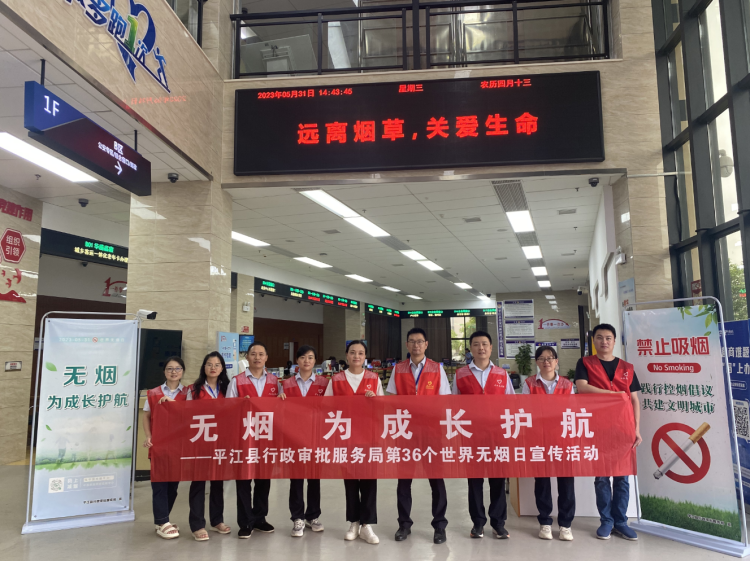 5月31日是第36个世界无烟日,县行政审批服务局组织开展以“无烟 为成长护航”为主题的无烟日宣传活动,旨在积极构建青少年控烟防护网,营造一个无烟、清洁、健康的社会环境,巩固无烟机关、无烟大厅建设成果。