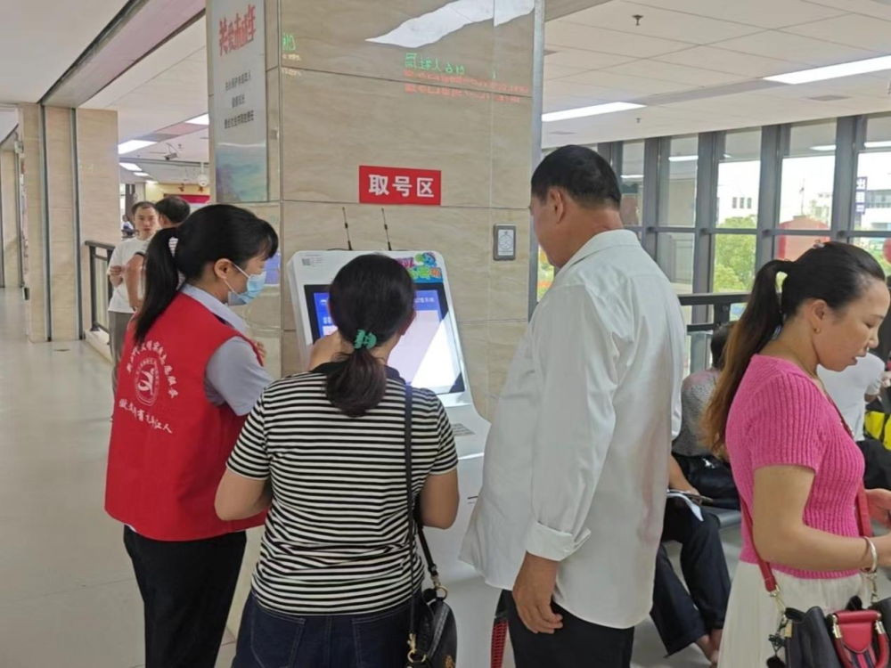 7月17日上午,政务大厅志愿者为办事群众提供取号服务。