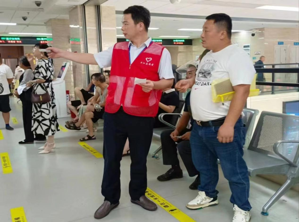 7月18日上午,政务大厅志愿者为办事群众提供指引服务。