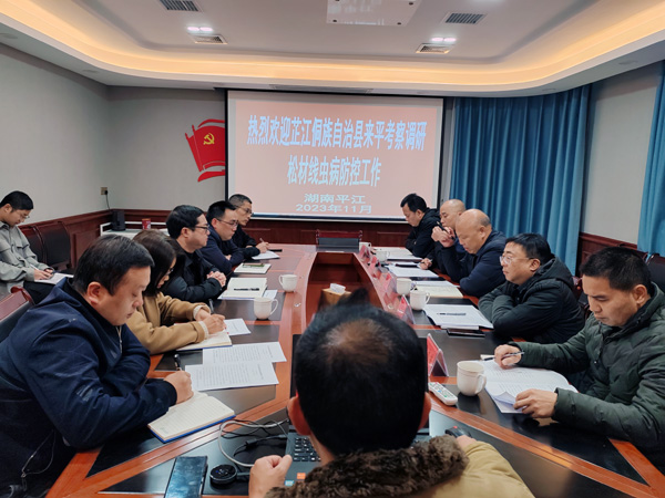 11月30日,芷江侗族自治县林业局副局长杨学祥带队一行5人来到平江,就材线虫病防控工作开展考察交流。平江县林业局副局长邹武及相关股室负责人参加。
