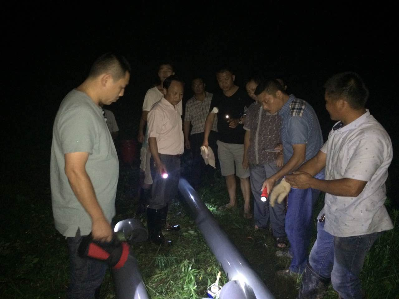 同晚,巡查发现金窝村潘坳组大山塘渗漏险情后,三阳乡立即从县水务局借来虹吸管,同时由乡长调度,组织联村干部、村干部、乡应急大队队员共计30余人前往现场处险。在县水务局技术人员的指导下,抢险力量合力组装30余米虹吸管,插入山塘导水排洪。从4日晚7点到5日凌晨5点,通过干群近10个小时的协力作战,山塘险情成功化解。