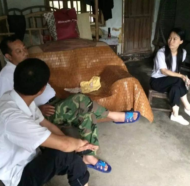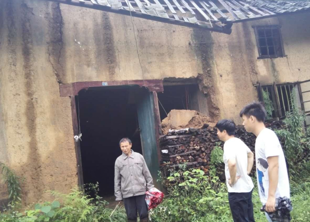 镇党委委员、人大主席危细明、办村干部李永强看望居住在危房中的五保户唐混中,提出房屋重建事宜。