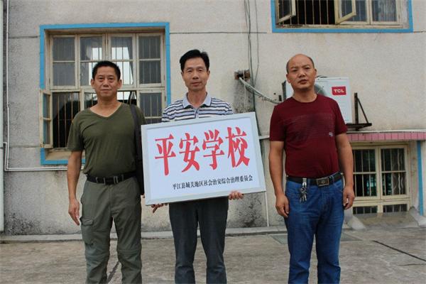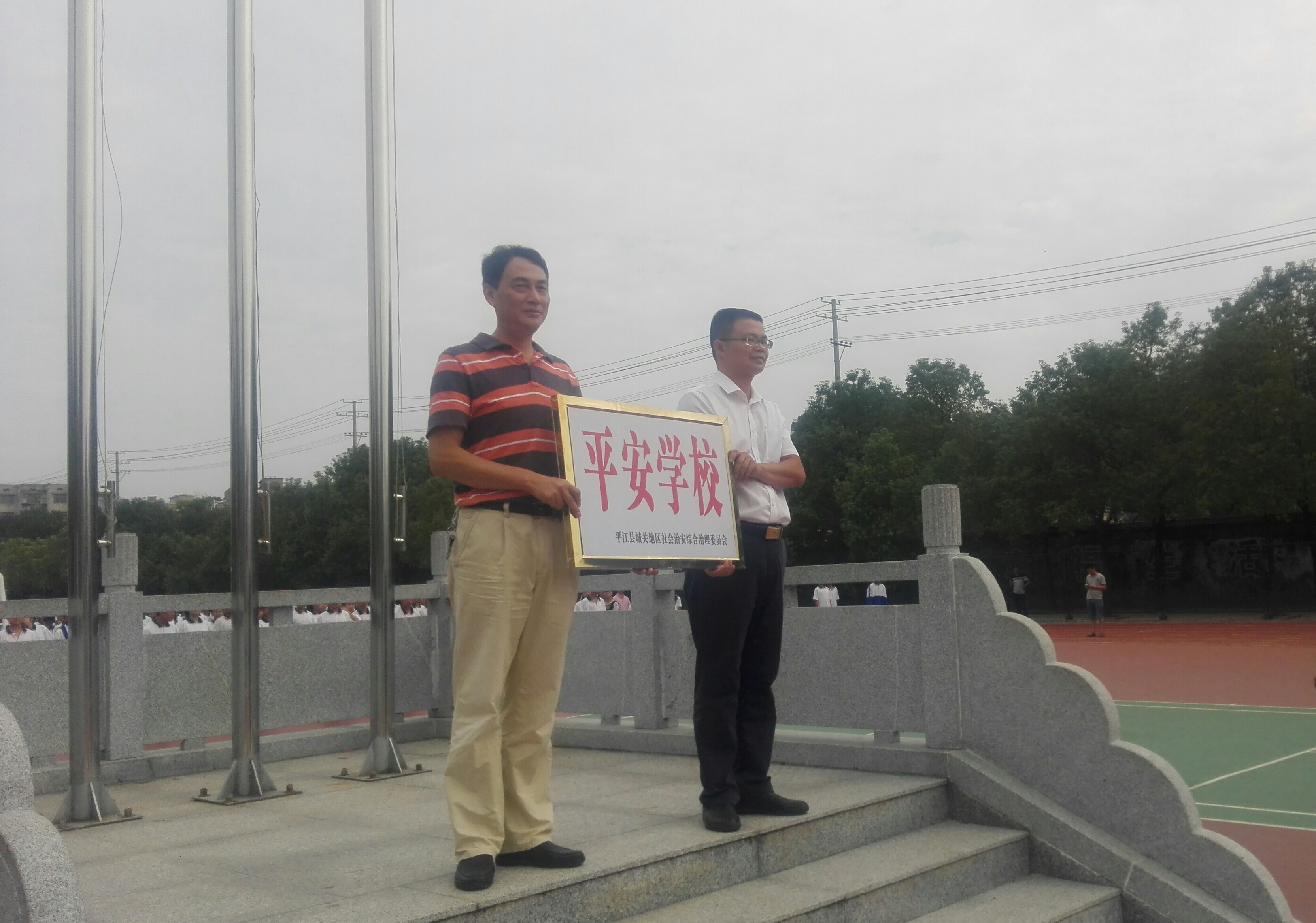 9月20日,启明中学利用大课间时段全校师生集合,城关镇综治委主管领导将写有“平安学校”的奖牌授予校长手中。