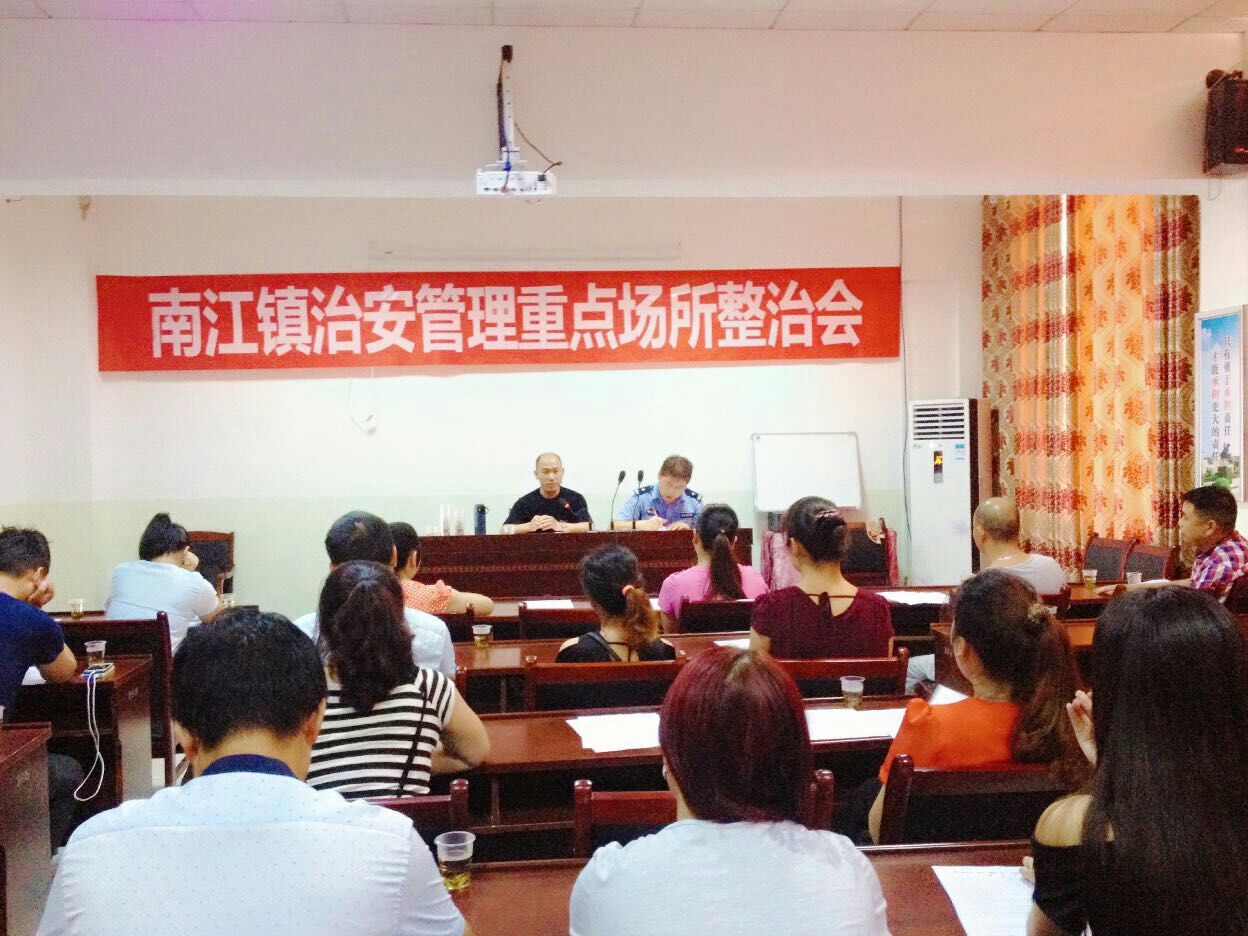 为加强南江镇辖区内宾馆、酒吧、网吧、KTV、足浴按摩休闲场所的治安管理,维护社会治安秩序,8月9日,南江镇召开了治安管理重点场所整治会,镇综治办、派出所和镇内51家休闲场所负责人参加。