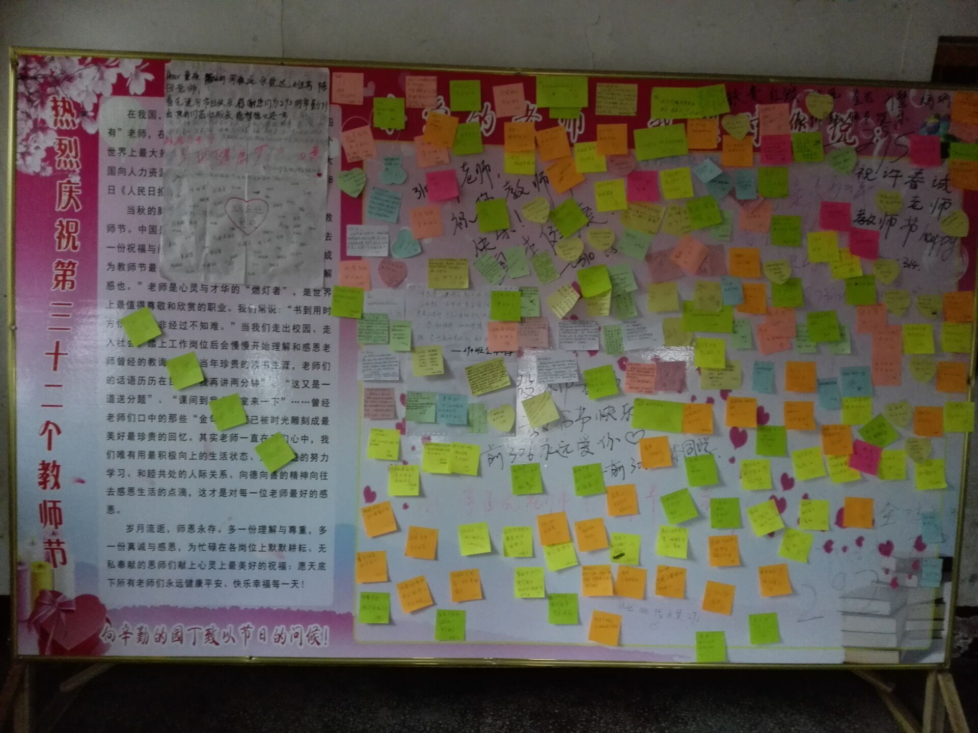 在所有的活动中,最引人关注的是“亲爱的老师,我想对您说”话题征集活动。此活动是由学校团委、学生会牵头组织的,学生们听闻有此活动都异常主动,纷纷利用课余时间在精美的贴纸上写下自己想对老师说的真心话,并通过广播、宣传栏等形式表达感念师恩、祝福老师的深情厚意。