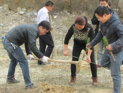 植树当天,春意盎然,阳光明媚。植树现场人潮涌动,镐锹翻飞,处处欢声笑语,好一派热火朝天的景象。在镇领导的带领下,大家二人一组、三人一群,干劲十足,有的扛树苗,有的挖坑,有的扶苗,有的培土,有的浇水施肥。仅半天时间,一排排新植的幼树就布满了山坡,迎风挺立,彷佛向人们招手致意。据统计,此次活动共栽植国外松、樟树、杉树等树木6000多株。