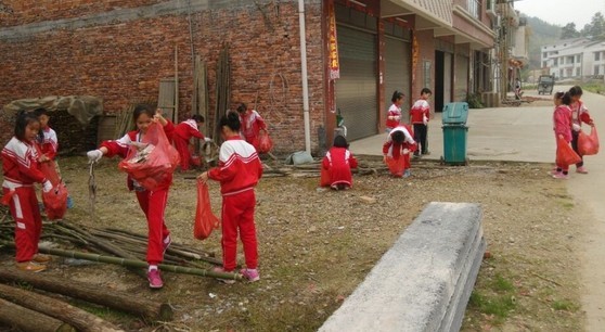 下午三时,参与活动的师生分成四队走出了校门。他们戴着手套,拎着垃圾袋,眼睛专注地盯着地面,马路两边的废弃物、生活垃圾、纸巾、食品袋等各种垃圾纷纷被拾起。尽管有的垃圾被埋了一截在地里,有的垃圾漂在马路边的水沟,有的垃圾满是尘土快认不出来……但都难逃细心的师生的“法眼”,被一一“收入囊中”。不一会儿,每个人手中都已“战果累累”。虽然满头是汗,可大家没一个人喊脏、喊累,有些同学还展开了比赛,看谁捡得又多又快。有些过路的村民们看着师生忙碌的景象,十分感叹,纷纷表示要向这些小朋友们学习,一起动手来改变我们的生活环境。