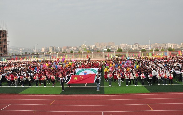 开幕式首先进行的是入场式。国旗队成员抬着鲜艳的五星红旗走在49个方阵的最前面,紧随其后的是校徽方阵、鼓号队方阵、腰鼓队方阵、鲜花队方阵、彩旗队方阵、气球队方阵,以及各班方阵依次从主席台前经过,接受检阅。