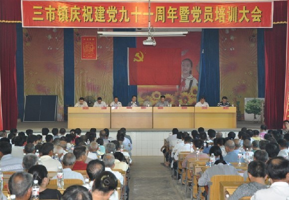 7月1日,三市镇召开建党九十一周年暨党员培训大会, 450余名党员欢聚一堂,回顾历程,缅怀过去,共庆党的91岁生日。会议由镇长熊昭明主持。