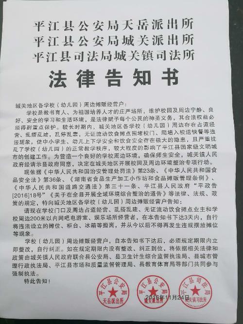 城关镇综治领导小组根据这一情况迅速启动综合治理方案,决定立即联动各执法部门印发《法律告知书》:凡在学校及周边占道经营、乱搭乱建、无证流动营业、乱停乱靠以及学校周边200米的网吧、娱乐场所等非法行为坚决打击,予以取缔!