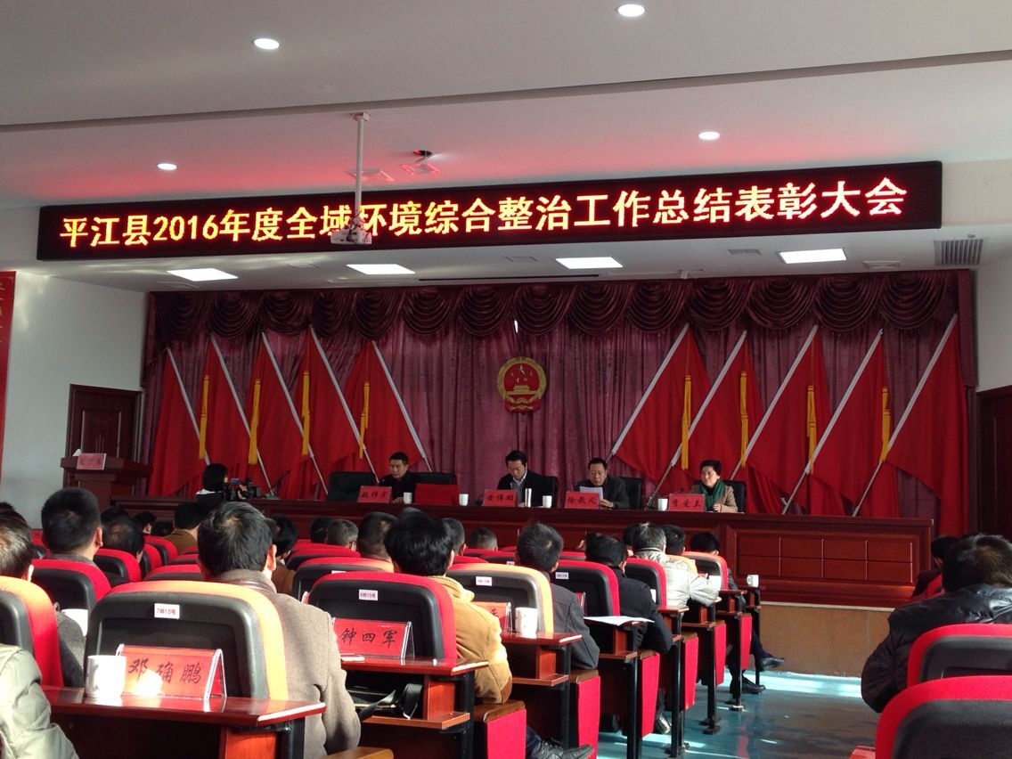 1月12日下午,“平江县2016年度全域环境综合整治工作总结表彰大会”在梅仙镇召开,参加本次表彰大会的有:县长黄伟雄,县政府党组副书记、副县长徐教凡,副县长魏移宗,副处级干部李爱兰,县直有关单位主要负责人、分管负责人,梅仙镇、瓮江镇党委书记,各乡镇乡镇长、分管负责人、整洁办主任,梅仙镇全体党政负责干部、整洁办干部职工、村支部书记。
