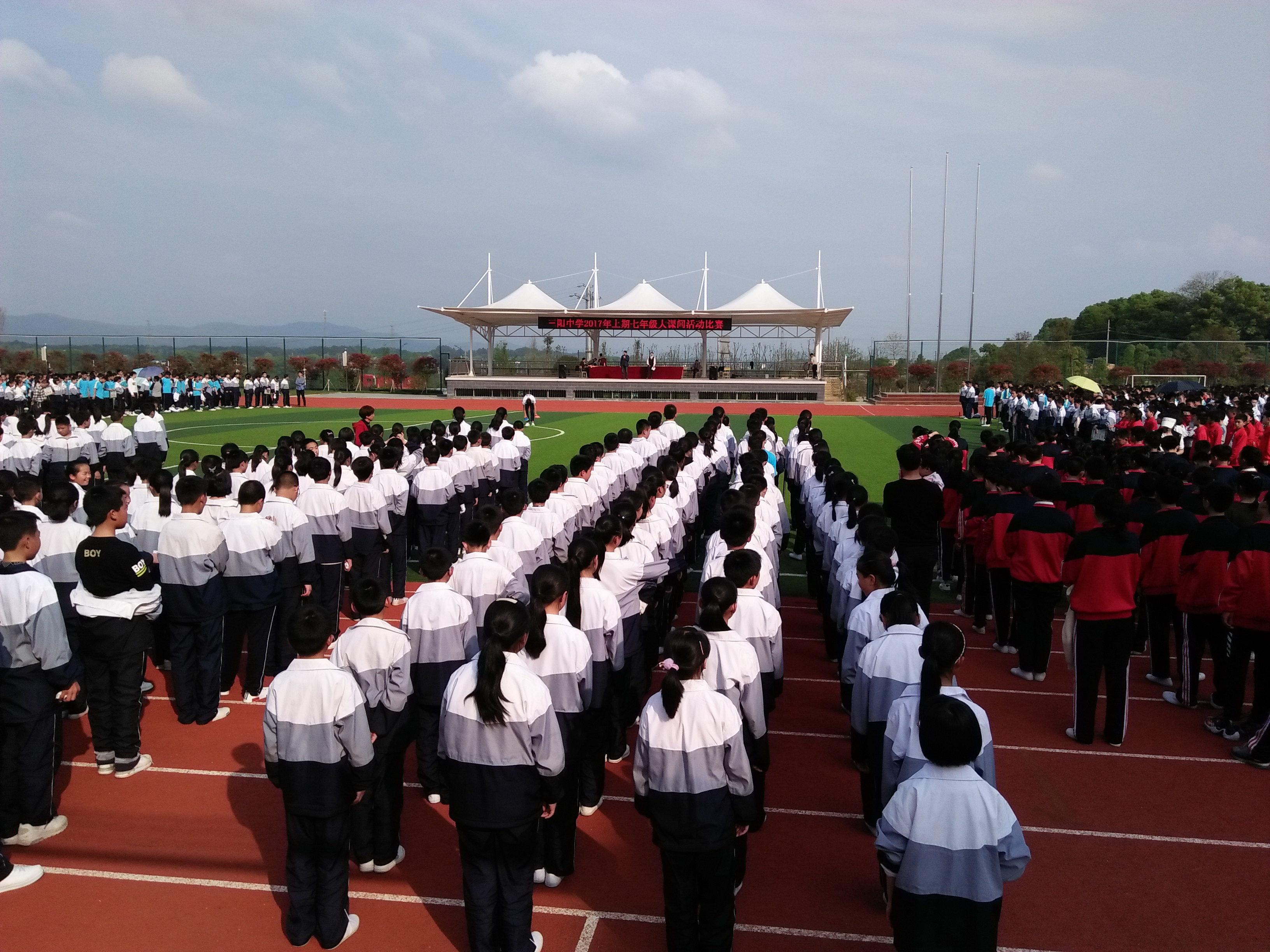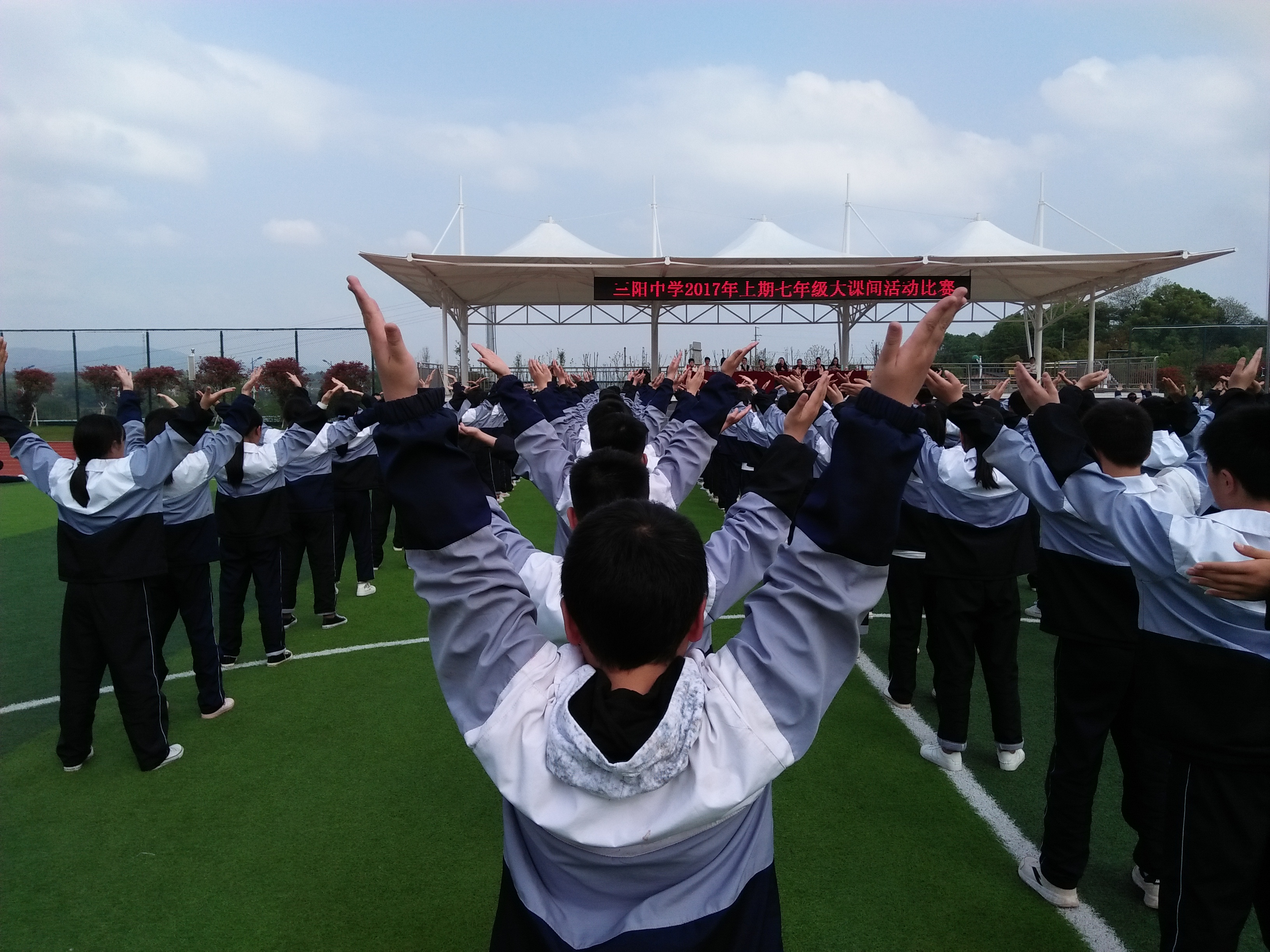 4月7日下午,三阳中学2017年上期七年级大课间活动比赛如期举行。20个班级先后上场,表演了广播体操、韵律操各跑步。这是该校阳光大课间活动的一次集中展示,也向全校师生吹响了运动集结号。