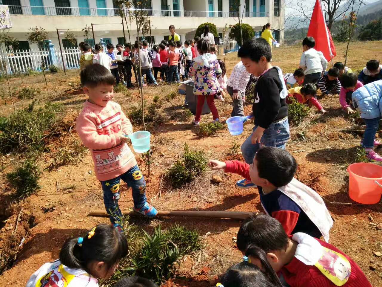 孩子们在老师的带领下都行动起来了,大班的孩子和老师一起亲手将小树苗种下, 再用泥土小心翼翼的盖上, 并为去年植树节时种植的果树进行松土 ,老师采用生动有趣的的教学方法指导孩子们认识不同的树木。中小班的孩子负责为小树浇水,挽起袖子为植物清除杂草,他们都忙得不亦乐乎, 体验种植带来的快乐。