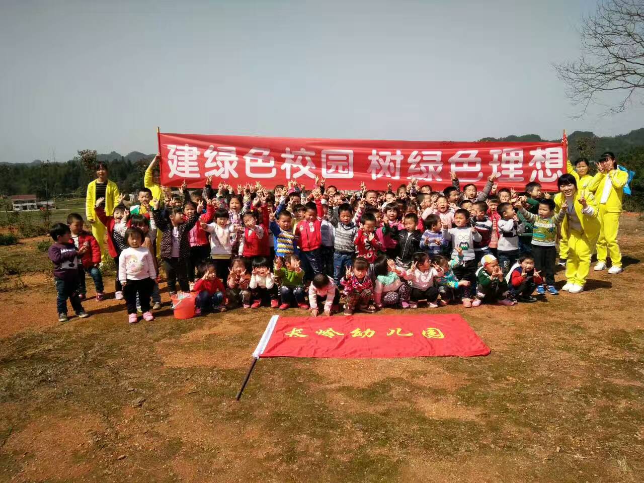 瞧,两园的孩子们兴高彩烈地排着队伍,带着小工具(小水桶,小铲,垃圾袋),在老师带领下,来到长岭幼儿园旁的种植园。