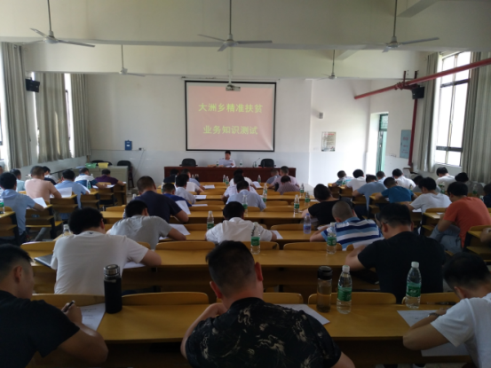 6月10日上午9:00大洲乡在乡中心小学组织开展第一期精准扶贫业务知识测试,全体机关干部、部门负责人、支部书记、村主任、扶贫专干、贫困村驻村帮扶工作队长参与测试。本次测试由乡党委书记曹建春,副书记、乡长江新华监考。
