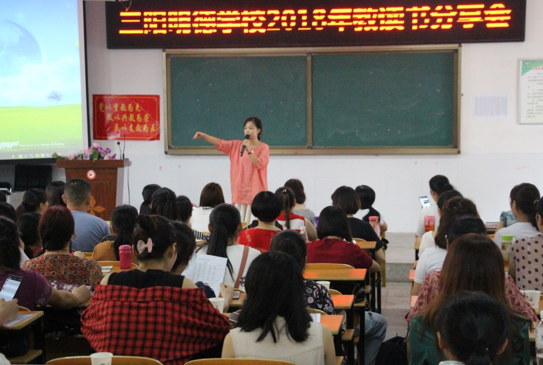 “读一本好书,品一抹墨香,觅一方净土,安置浮躁的心灵。心,因宁静而高贵;心,因高贵而超凡脱俗”。妙语声中,主题为“人人爱阅读,‘悦’读‘悦’分享”暑期教师读书分享会8月28日下午在三阳明德学校电教室隆重拉开帷幕,110余位教师参与了分享活动。
