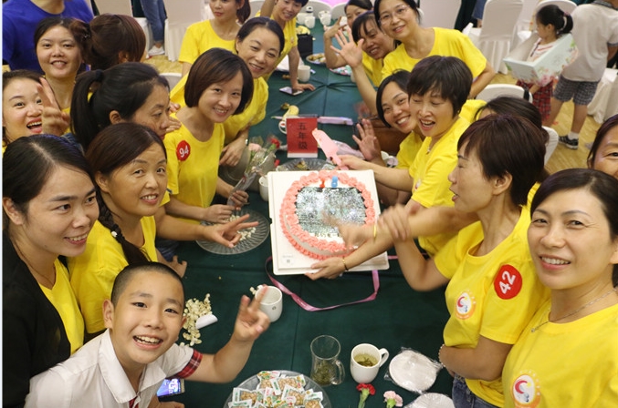 七个年级组的教师分别身着统一颜色的文化衫,七种颜色显得格外鲜艳,她们围坐在七张大桌周围分吃节日蛋糕,一家人的感觉不言而喻。整场活动,声笑语不断,幸福温馨的场景贯穿始终。
