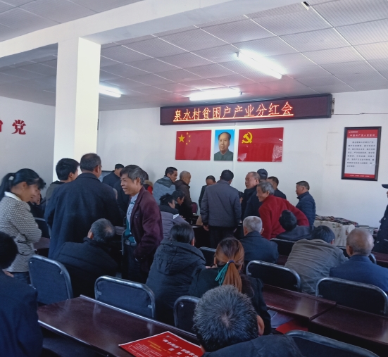 近日,龙门镇泉水村村民服务中心热闹非凡,群众进进出出,喜笑颜开。村部会议室内,泉水村的支村两委干部和驻村帮扶队员正紧张忙碌地给贫困户核算分红收入,合作社今年养殖的2000羽鸡,100羽鹅已经出栏售卖。
