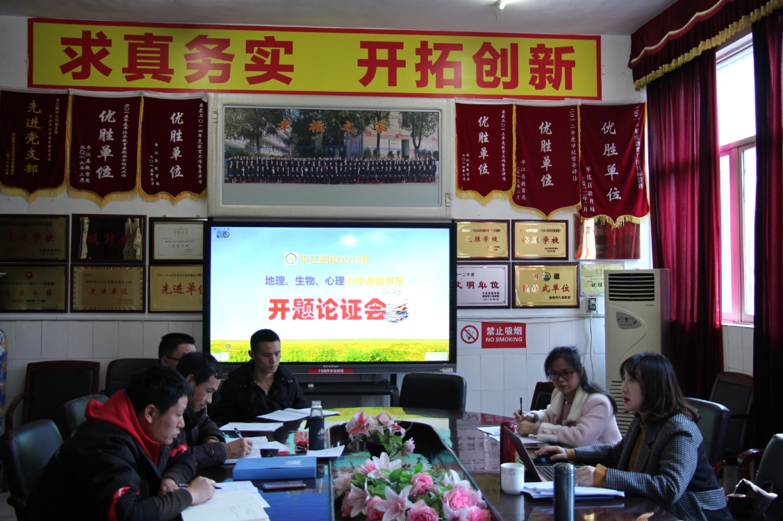 百花争春,论证酣热。3月10日上午,岳阳市教科院教研室专家严雪梅、平江县教研室李梦兵,以及县一中、二中相关课题组成员,齐聚平江四中,共同出席由该校申报的地理、生物、心理三个市级课题开题论证会。