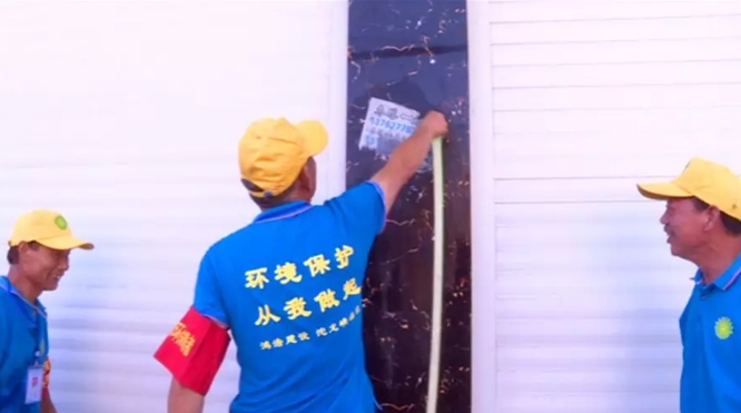 8月的一天,热浪滚滚,上塔市镇十余位环保志愿者走上106国道,对两侧电线杆、路灯杆和居民楼外墙上的“牛皮癣”进行全面清理。年过六旬的刘梯桥是上塔市镇环保志愿者协会会长,每隔一段时间,他就带领志愿者走村入户,按照“干净、整洁、清爽”的目标对全镇环境卫生进行检查。