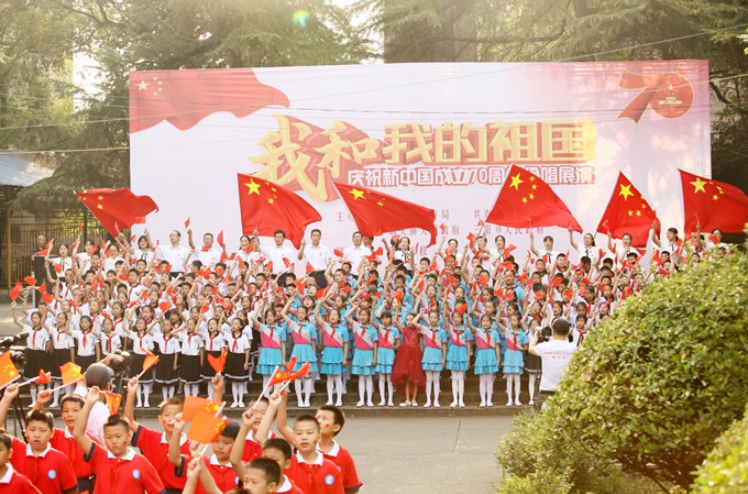 “我和我的祖国,一刻也不能分割,无论我走到哪里……” 9月27日上午,由县教育局、团县委、城关镇和三阳乡人民政府主办,汉昌学区承办的《我和我的祖国》大合唱展演活动在天岳广场、人民公园、彭德怀文化广场、甲山河风光带、老城烈士陵园同步精彩上演。来自该学区的九所城区中小学校一万余名师生以昂扬的姿态唱响时代之歌,用一场场精彩的视听盛宴,向中华人民共和国成立70周年献礼。
