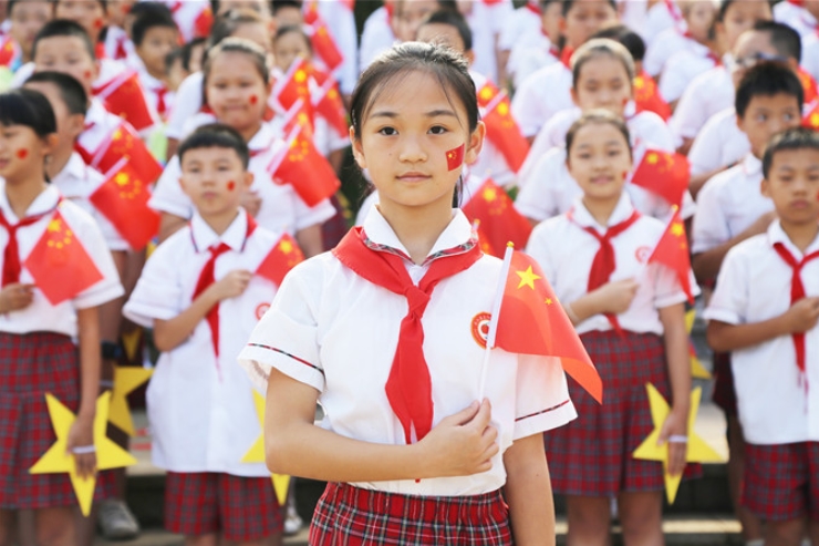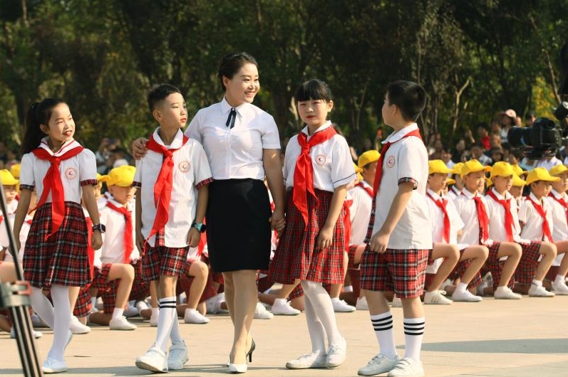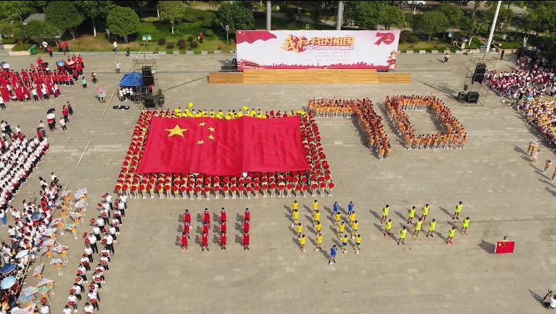 “今天是你的生日,我的中国,清晨我放飞一群白鸽.....”在甲山河风光带广场上,桂花学校和三阳明德学校的师生们正以昂扬的姿态,唱响时代之歌,表达对新中国成立70周年最真挚的祝福。