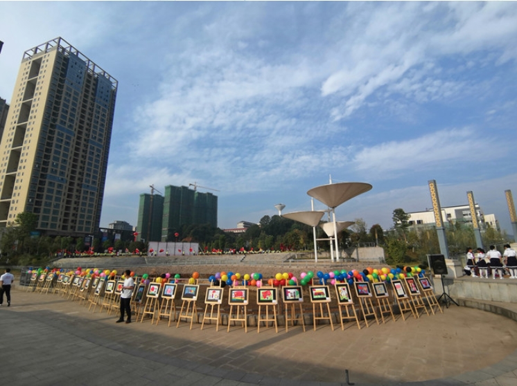 广场四方,学生纵队变形五角星、师生诗歌朗诵、画笔描绘祖国,通过各种场景变换,来自新城学校和芙蓉简青学校的师生们把对祖国真挚的祝福,浓缩在有限的时空里。