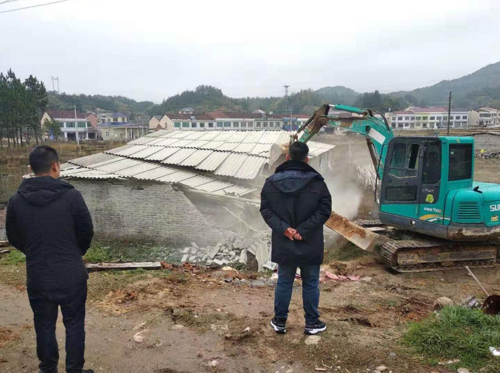 11月28日当天,南江镇综合执法大队、建管站、国土所、国土执法中队等相关部门40余人组成联合执法队伍,动用挖掘机1台,车辆6台,对该处养鸡