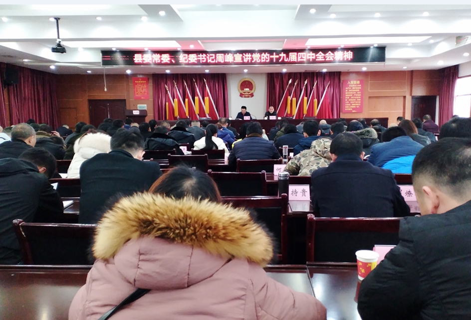 11月28日,南江镇召开党的十九届四中全会精神宣讲暨当前重点工作部署会。县委常委、纪委书记、监委主任周峰参加并作党的十九届四中全会精神宣讲。南江镇全体机关干部、村(居)支部书记、部门负责人、驻村扶贫工作队等参加会议。镇党委书记李三军主持会议。