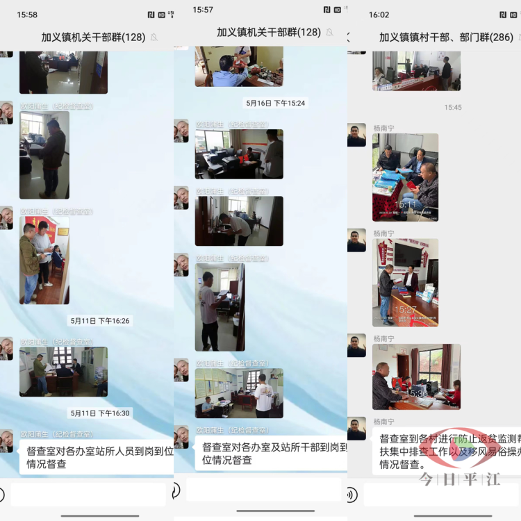 加义镇纪委先后组织开展对全镇34个村(社区)和机关干部每周不定期一到两次在岗情况、工作状态、工作运行情况、服务态度、业务水平、办事效率、岗位纪律、工作作风等暗访督查行动,重点督察会风及干部打卡出勤情况,同时对督查情况进行通报,加大对镇村干部队伍的作风效能督查结果的合理运用。