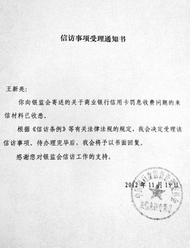 根据王新亮提供给本报的银监会回复,银监会在回复给王律师的《信访事项受理通知书》里称,根据《信访条例》等有关法律法规的规定,我会决定受理该信访事项。待办理完毕后,我会将予以书面回复。