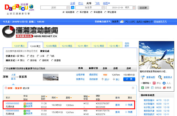 网民如何通过达达搜网站购买火车票,记者昨天体验了一把,第一步是打开达达搜(dadasou.com)网站,在页面上的“出发地”输入框中输入“深圳”,在“目的地”中输入“张家界”,日期选择“2010年12月8日”,然后搜索,页面呈现出丰富的结果,包括深圳到张家界的直达航班、直达火车,直达巴士,从长沙转机坐巴士到张家界,坐火车/巴士从广州转机/转车到张家界,坐飞机到常德转车到张家界等235种路线选择结果。