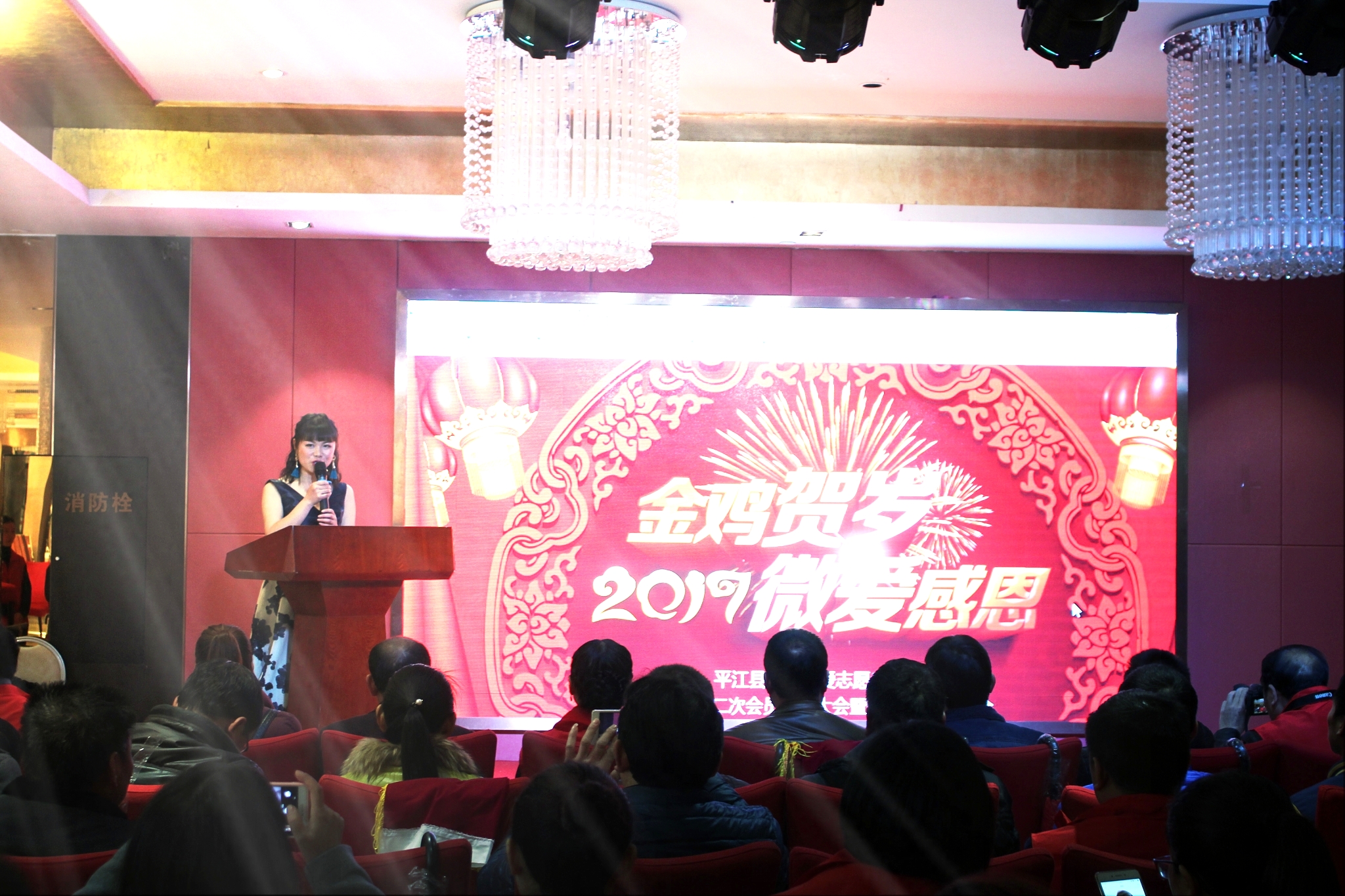 “把别人的幸福当做自己的幸福,把鲜花奉献给他人,把棘刺留给自己……”绚丽的舞台,激情的泪水,火红的会标,构成了这个寒冬里喜迎新年的最佳礼物。1月22日下午,平江县小城微爱志愿者协会一届二次义工代表大会暨2016年终总结会在南江镇福隆大酒店隆情举办。一百多名义工伙伴与爱心人士、南江镇政府、南江学区、受助学校及学生代表欢聚一堂,“金鸡贺岁,微爱感恩”,他们以给优秀义工颁奖,为爱心老板、最佳项目合作方授牌,给寒门学子发放奖学金等方式,讲述公益路上的酸甜苦辣,总结表彰先进人物,部署来年工作。