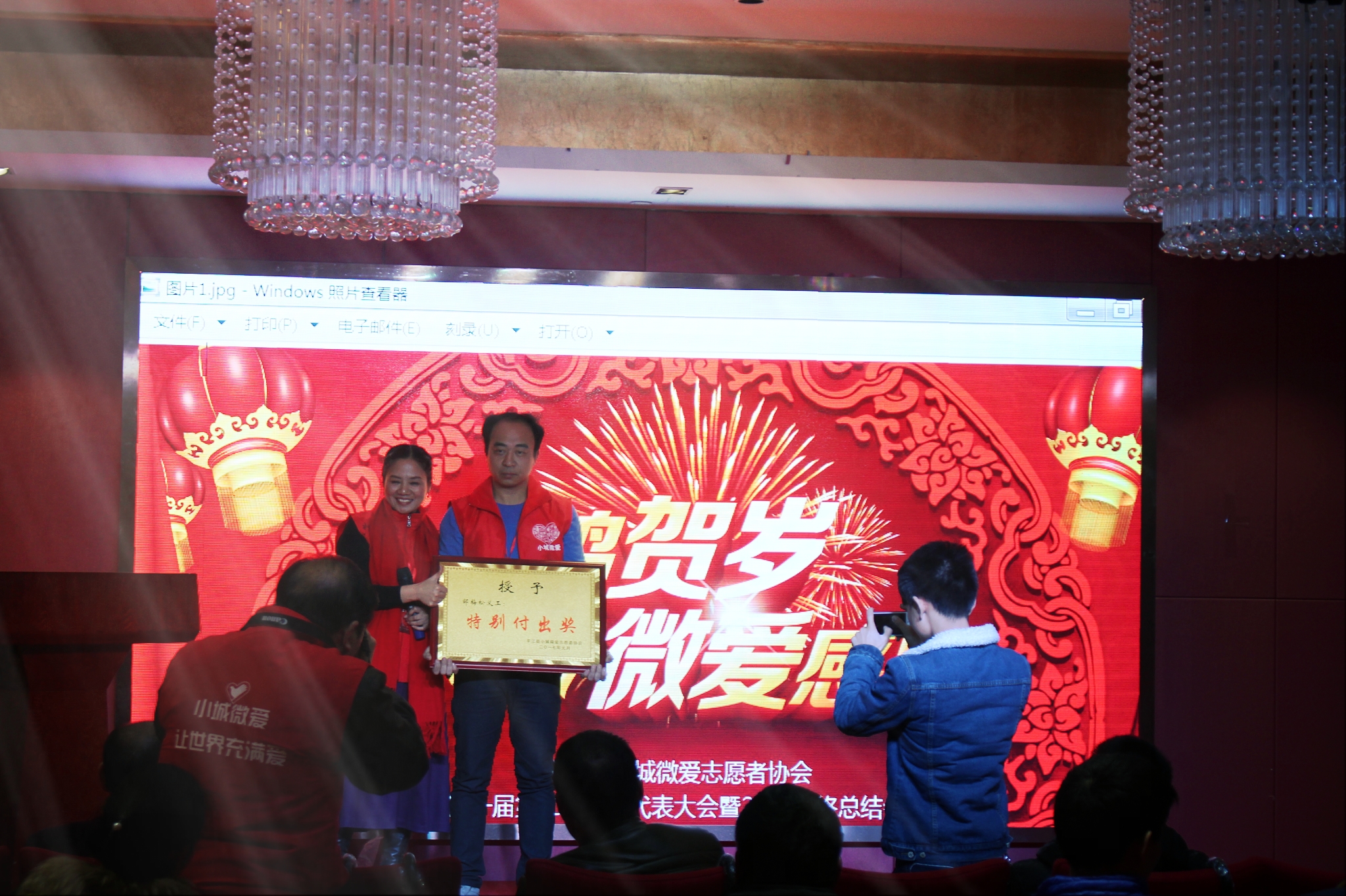 年会始终贯彻“和谐、爱心、责任、奉献”的主旋律,当天刚刚订婚的邹妹玲老师怀揣着幸福的喜悦之情毅然担纲现场主持。小城微爱协会会长方迎宾女士首先致辞,她用款款深情、感人故事回忆了组织由小到大、由弱到强、由不理解到获得支持的艰辛创业史,用一串串真实的数字来幸福地诠释着协会助学、扶困、怜恤孤寡、维护大型活动等感人场面。接着,小城微爱“慈善天天捐”项目负责人何玉霞老师以晒图文和播视频的方式,给大家讲解了平台筹款情况及发放方式,特别是讲到用这笔爱心款来资助贫困学子,为他们发放爱心物资时,几度控制不住自己激动的情绪,几度真情落泪,大家被她宽广无私的大爱所感染,现场一度寂静。随后,在《运动员进行曲》激越的旋律声中,协会管理人员和现场司仪义工为姜今嘉等20位“最美义工”颁发证书和奖杯,为友情合作方平江爱心顺风车队负责人授锦旗,为受助优秀学生分各学段发放了100至300元的奖学金。本土电影明星“文祥”之父、板江站负责人王约泉一家人致力公益事业,喜获“最美家庭”奖,南江站负责人欧阳怀忠、杨荃夫妇被评为“最美夫妻义工”,执行会长邹梅松获得“特别付出奖”。