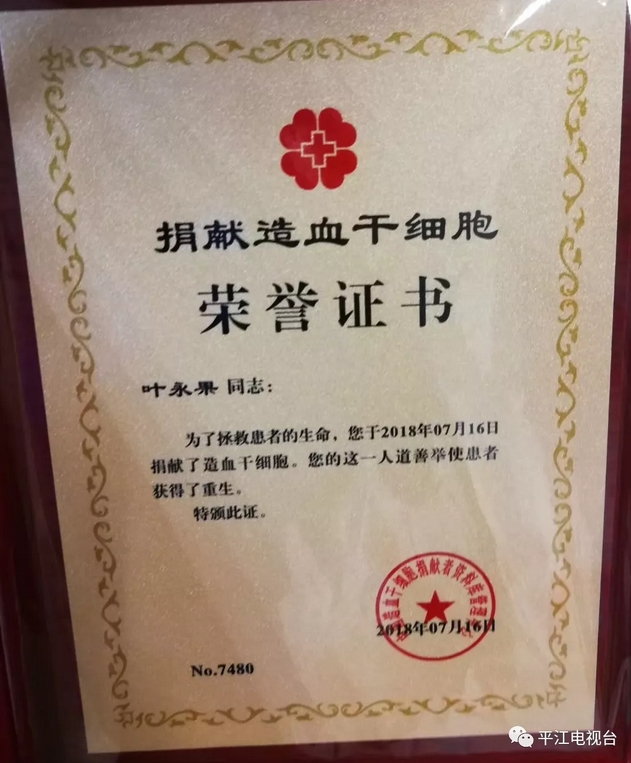 7月16日,我县第16例造血干细胞捐献者叶永果成功捐献,他的无私奉献,成功挽救了一个白血病患者的生命。据悉,平江县广播电视台继钟建武成功捐献造血干细胞后,叶永果是第二例捐献者。