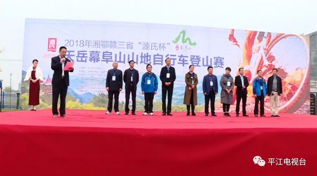 湖南省体育局群体处副处长何创福宣布2018年湘鄂赣三省天岳幕阜山山地自行车登山赛开幕。副县长潘如意等出席开幕式。她表示,这次活动选择在国家级森林公园天岳幕阜山风景区举行,既是落实党的十九大精神要求,广泛开展群众性体育活动,加快推进体育强国建设的具体行动,也是对平江体育事业和旅游发展水平的一次高规格检验,更是一次让全国更多的朋友走进平江,感知平江的机会。她希望透过比赛,能让更多的人了解和走进平江,同时,努力掀起全民健身的新高潮,让更多的人真正享受到运动带来的健康和快乐。