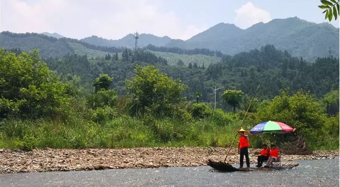 漂流中,竹筏均用人工撑筏。游客坐在竹筏的椅子上,两岸林木茂盛、风景如画,脚底下是缓缓流淌的清澈美丽的丽江,耳边有潺潺流水声、竹竿打水声、鸟鸣虫叫声,乡村夏日的悠闲时光如丽江水一般安静流逝。