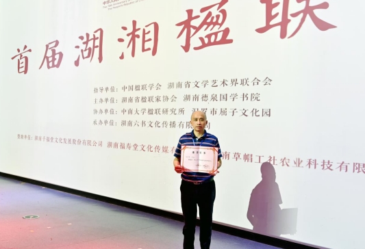 9月28日,“首届湖湘楹联大会”在长沙石燕湖公园开幕。颁奖仪式上,中国楹联学会会员、平江县天岳公益文化中心主任、公益书画家陈龙江荣获“湖南省对联文化传承人”称号。
