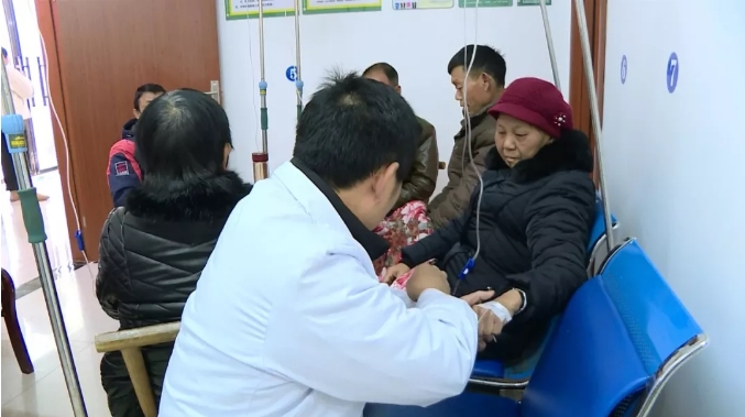 这是在南江镇罗洞村卫生室,村医何拥军正在给感冒患者治疗。
