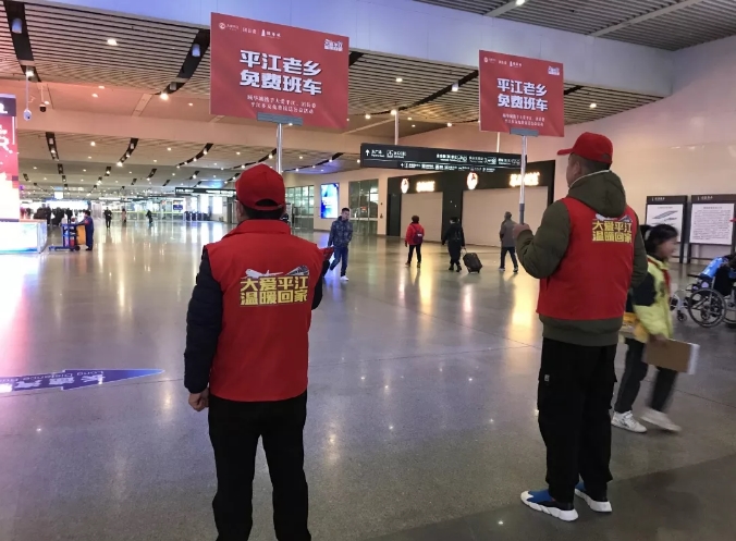 “旅客您好,您乘坐的深圳至长沙的G6182 已经到站,请带好您的随身物品。”随着长沙高铁南站播音员的温馨提示,一个个从天南地北赶回家过年的平江人,满怀激动的走向出站口。迎接他们的,是早早就等候在此的“大爱平江 温暖回家”爱心志愿者。