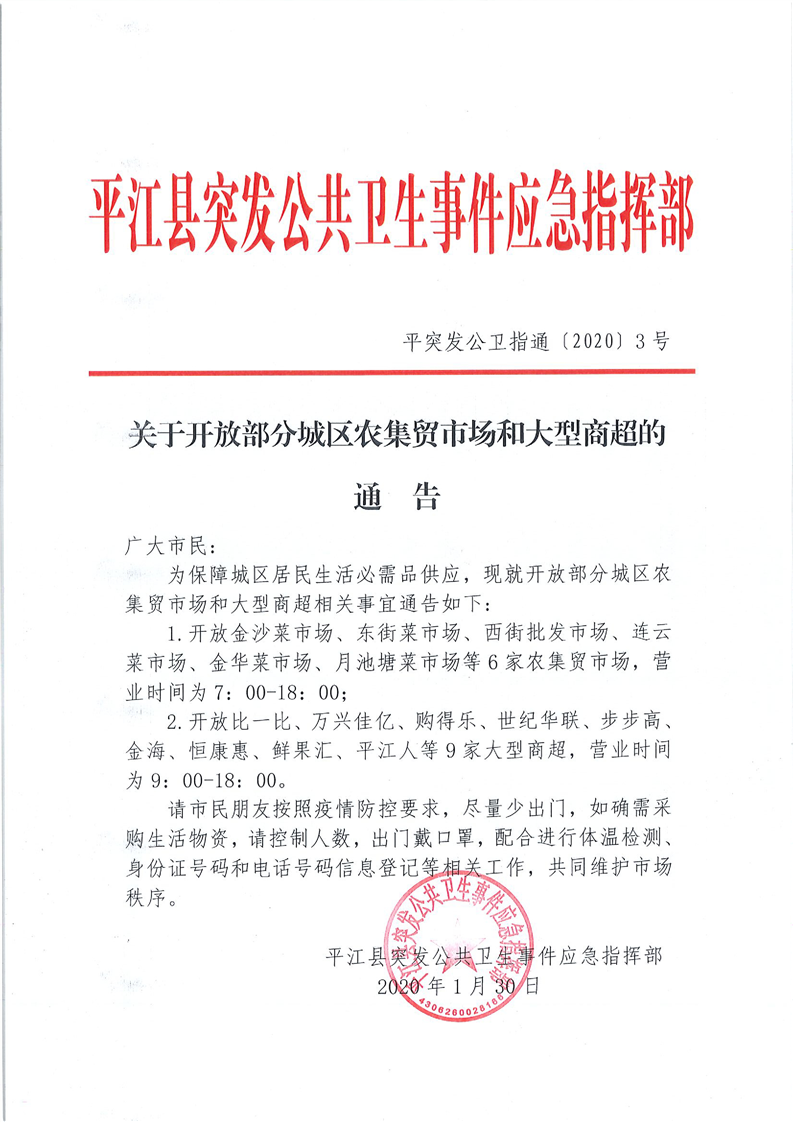 为保障县城中心城区居民生活必需品供应,根据县突发公共卫生事件应急指挥部第26号、27号指令要求,保留开放部分农贸市场、大型商超。