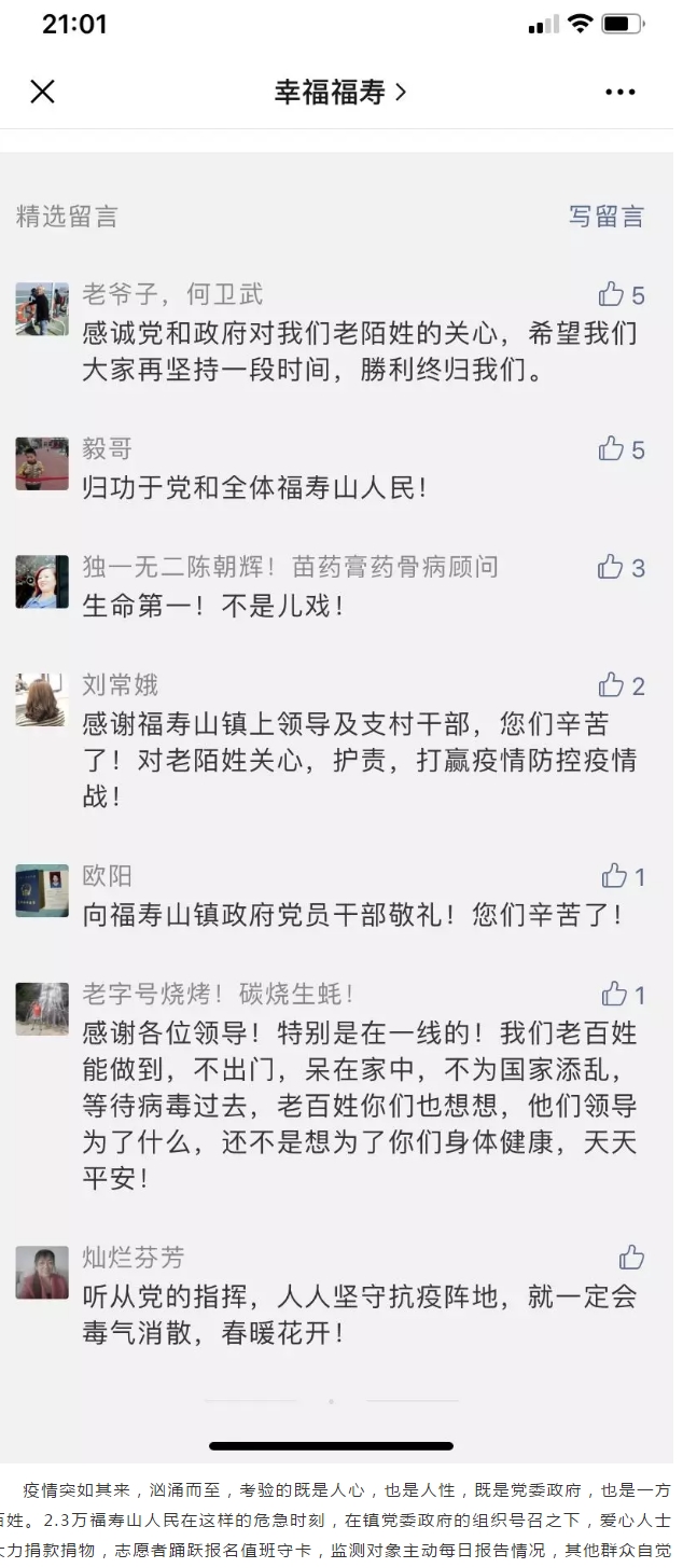 疫情突如其来,汹涌而至,考验的既是人心,也是人性,既是党委政府,也是一方百姓。2.3万福寿山人民在这样的危急时刻,在镇党委政府的组织号召之下,爱心人士大力捐款捐物,志愿者踊跃报名值班守卡,监测对象主动每日报告情况,其他群众自觉居家防护,这半个月来,福寿山人民做到了令行禁止,整齐划一,全镇上下紧紧拧成了一股绳,用团结抵抗住了“疫魔”的入侵。